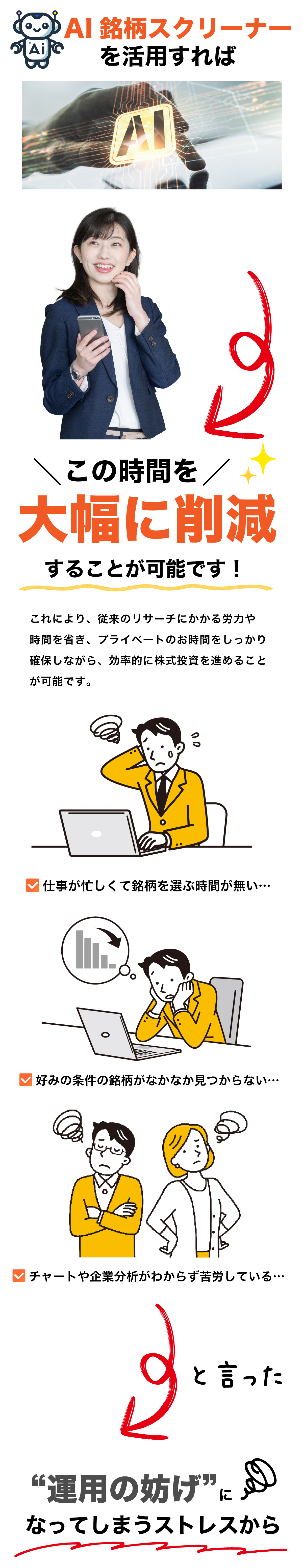 実際の投資商品の売買におきましては、自己資金枠等を考慮した上、ご自身の判断・責任のもとご活用をお願い致します。国内上場有価証券等には株式相場、金利水準、為替相場、不動産相場、商品相場等の価格の変動等および有価証券の発行者等の信用状況(財務・経営状況を含む)の悪化等それらに関する外部評価の変化等を直接の原因として損失が生ずるおそれ(元本欠損リスク)、または元本を超過する損失を生ずるおそれ(元本超過損リスク)があります。